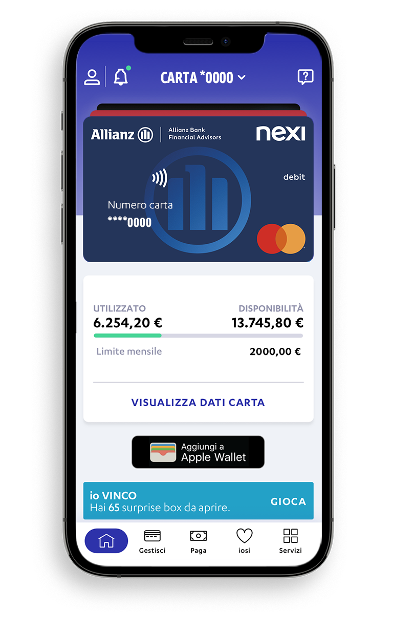 Allianz Bank Card è la carta di debito internazionale, abilitata al circuito Mastercard, che rappresenta l’impegno costante di Allianz Bank a garantirti innovazione e affidabilità, unito all’expertise di Nexi nei sistemi di pagamento.
